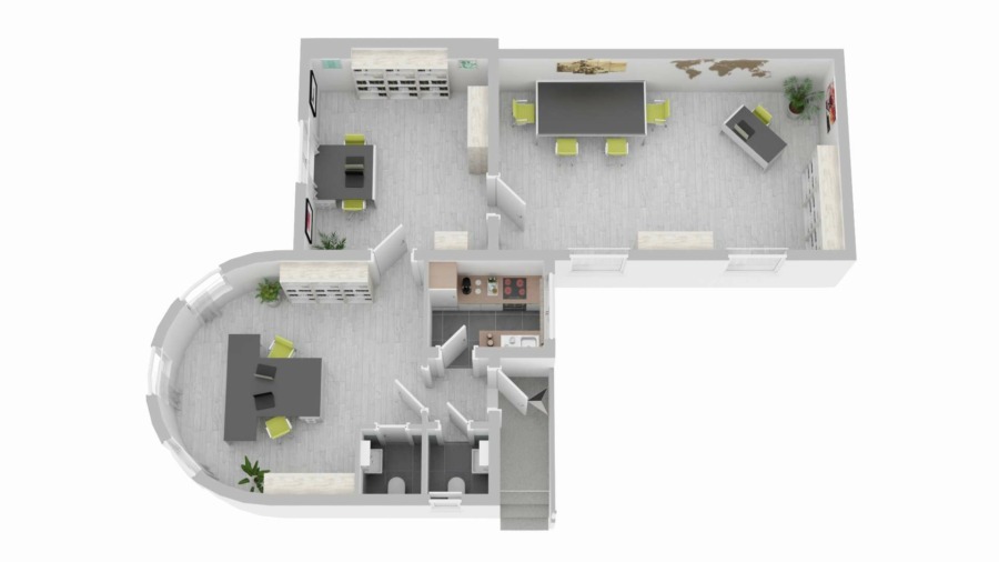 Die Flächen sind über einen separaten Eingang zu erreichen und liegen im Erdgeschoss des Gebäudes. Das Objekt verfügt über 3 Räume, eine Küche und getrennten WC's.