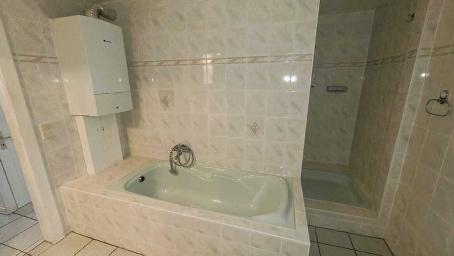 Dem Wohnzimmer schließt sich das Badezimmer an. Es ist zeitlos eingerichtet mit einer Badewanne und einer Dusche. Gleichzeitig beinhaltet der helle Raum die Gastherme.