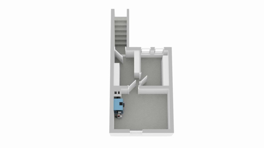 Über eine zeitlose Treppe erreichen Sie das Obergeschoss. Derzeit ist dort dort eine großzügige Küche, der Schlafbereich und ein renovierungsbedürftiges Bad untergebracht.