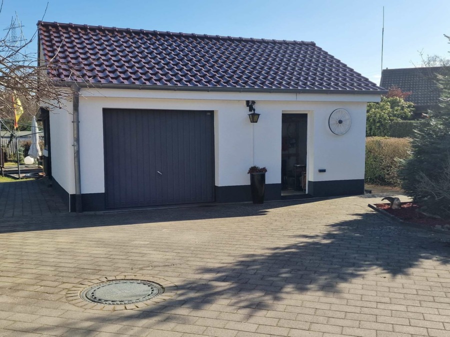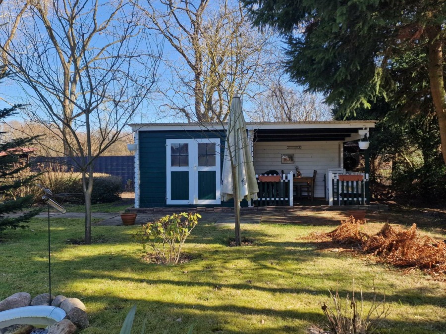 Der Außenbereich mit einem Garagenhaus, mit einem weiteren Gartenhaus und einem Grillplatz richtet sich sicherlich nicht an Gartenbanausen. Derjenige, der Lust auf Garten einhergehend mit ruhige Natur hat, ist hier herzlich willkommen, um z.B. in einem üppigen begehbaren Gewächshaus eigenes Obst und Gemüse anzupflanzen.