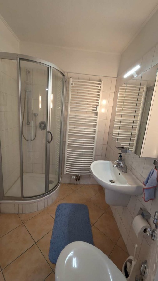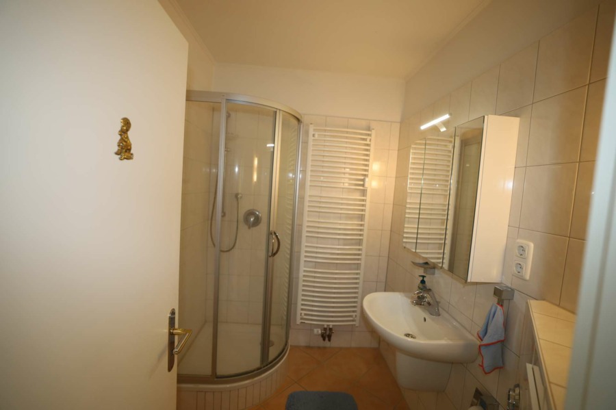 Dem Hauptschlafzimmer grenzt das moderne Badezimmer inklusive einer gepflegten Dusche an.