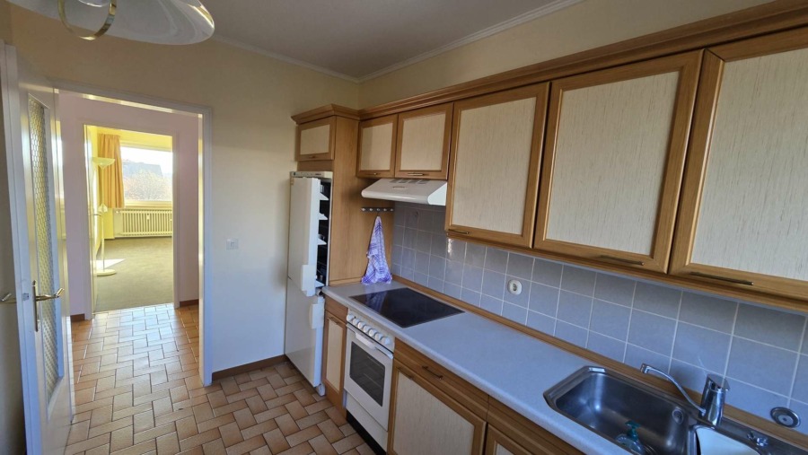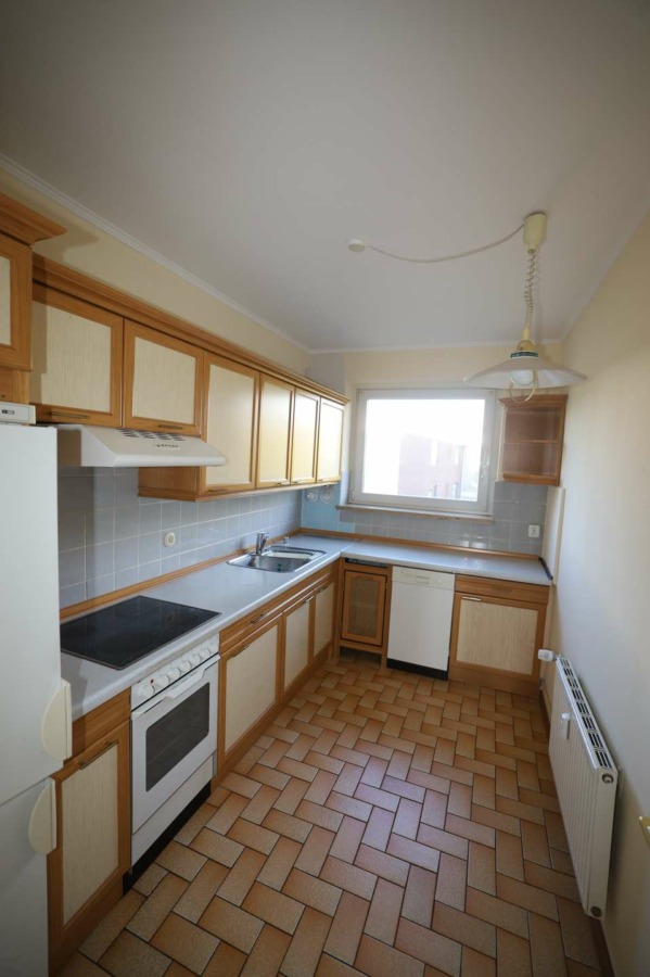 Linkerhand finden Sie sowohl die gut geschnittene Küche inklusive einer gepflegten Einbauküche als auch das größere der beiden Schlafzimmer.